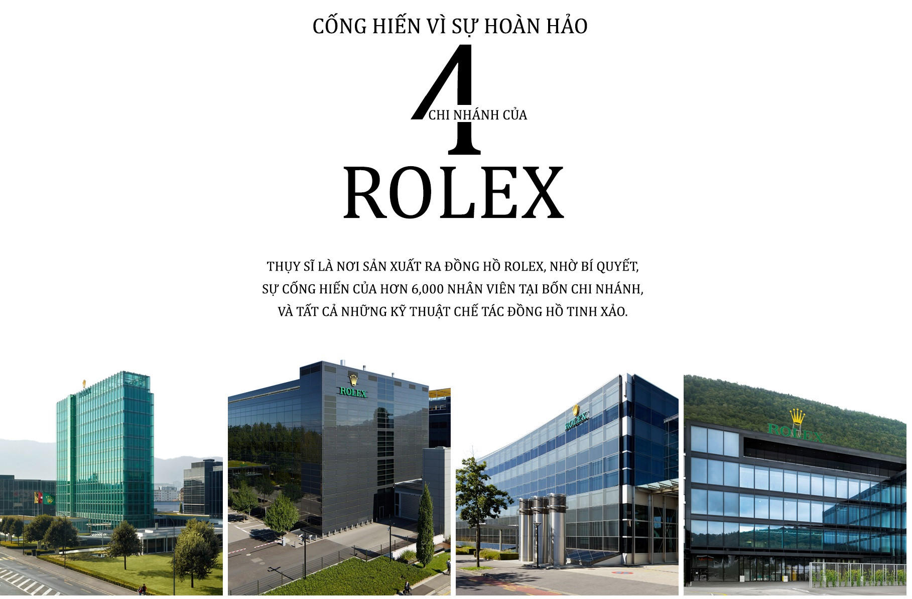 Trụ sở quốc tế của Rolex là ngôi nhà chung của ban quản lý, nhóm nghiên cứu và phát triển, thiết kế, hoạt động truyền thông, bán hàng và dịch vụ hậu mãi. Đây cũng là nơi phiên bản hoàn chỉnh của những chiếc đồng hồ được đưa đi khắp ba chi nhánh còn lại để kiểm tra chất lượng lần cuối.